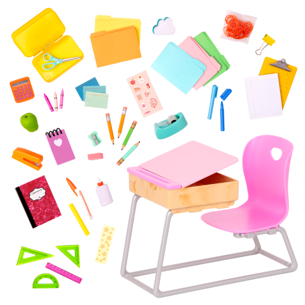 Seat your dolls at the pretty pink desk and get ready for a day of classroom fun. Open up the desk front and grab the geometry set with the pretend calculator to solve the teacher’s equations during math class. Then sharpen your pencils and open up the notebook so your dolls can write down their short stories – they can even keep a list of their bright ideas in the spiral notepad! Personalize your school desk by decorating it with the sticker sheet, and organize school projects with the 5 colored folders. The pretend stapler will keep your papers neatly together, and the sticky post-it notes really stick to create cute labels! Each accessory is perfectly sized to fit in your Our Generation doll’s hands, and the realistic details make school play extra engaging! (Dolls sold separately)